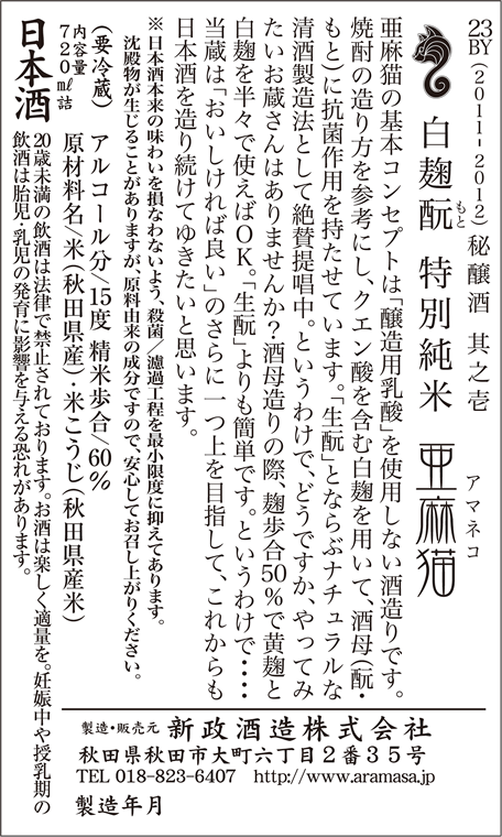 翌シーズン以降、製麹設備の見直しのおかげで、ようやく「亜麻猫」の根本的なブラッシュアップが達成されることを考えると、当シーズンはいわばこの銘柄にとって雌伏の時であったといえよう。 -